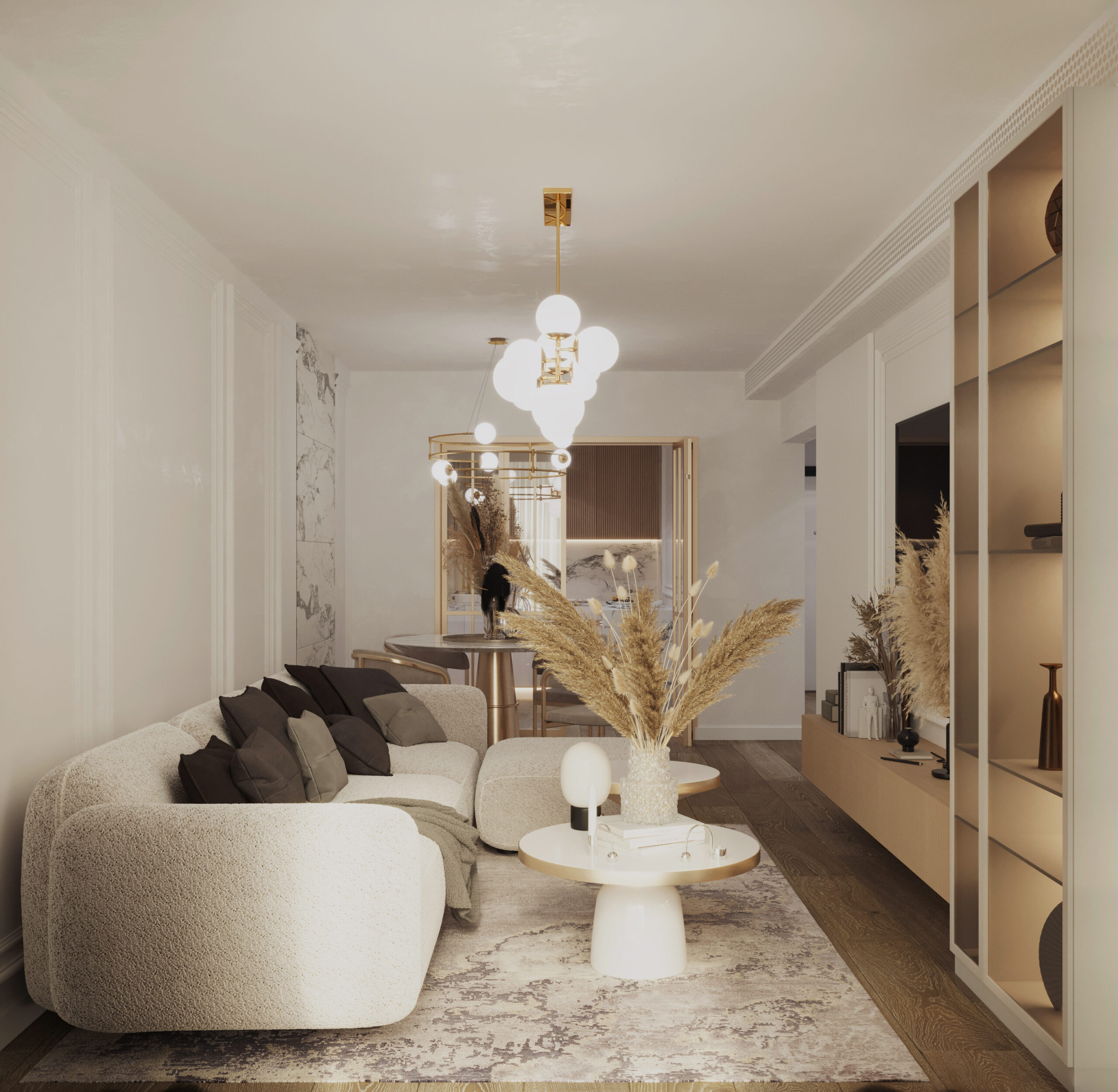 At the level of finishes, colors, textures, we keep the same unitary line in the apartment: gold, brass, white accents, the shade of a light oak wood and the fabric of the sofa, which even from the proposal refers to a very cozy material.